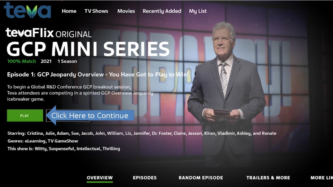 When working within clinical trials we needed to update our training for Good Clinical Practice for the FDA. During COVID, Netflix was at an all time high in popularity so we used an episodic like structure for our curriculum and I designed / added video bumpers to add flare to the content. The video would play through Storyline integration within Articulate RISE and the user would be able to click within the Netflix style screen to continue through the course.